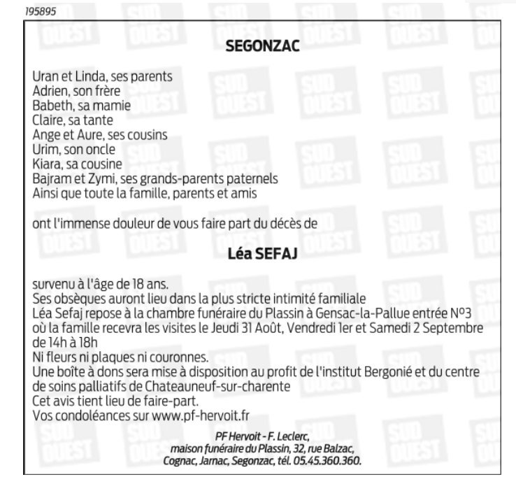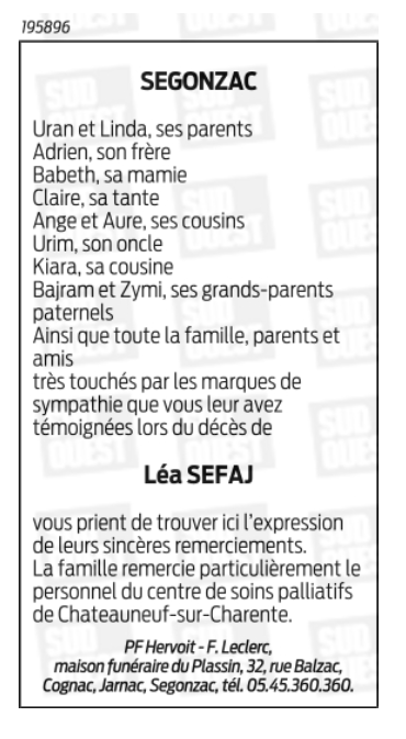 Cet espace « condoléances » est dédié à la mémoire de Madame Léa SEFAJ.