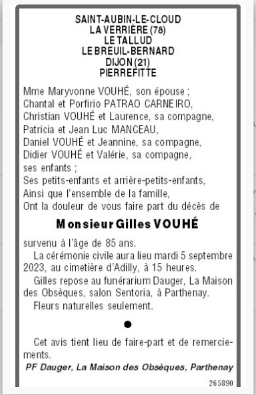 Décédé à Faye-l'Abbesse (79350) le samedi 2 septembre 2023
