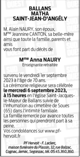 Décédée à Châteaubernard (16100) le vendredi 1 septembre 2023