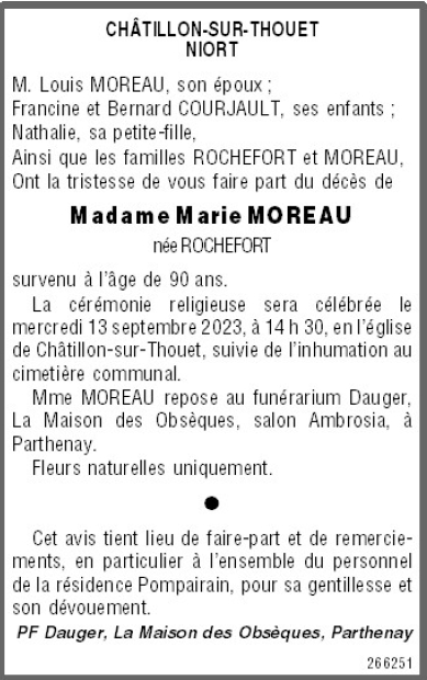Cet espace « condoléances » est dédié à la mémoire de Madame Marie MOREAU née ROCHEFORT.