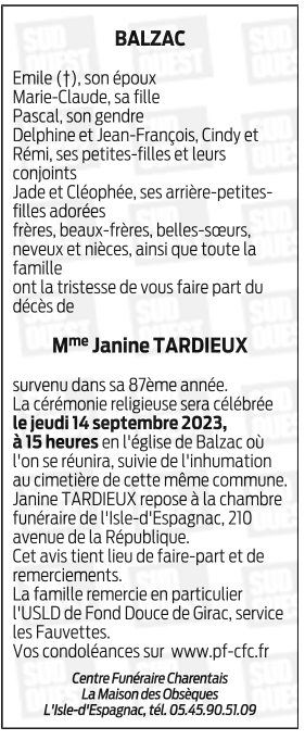 Cet espace « condoléances » est dédié à la mémoire de Madame Janine TARDIEUX née GARDILLOU.