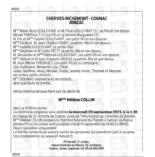 Cet espace « condoléances » est dédié à la mémoire de Madame Hélène COLLIN.