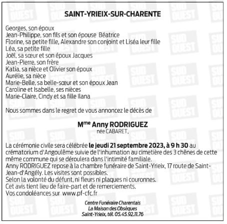 Cet espace « condoléances » est dédié à la mémoire de Madame Anny RODRIGUEZ née CABARET.