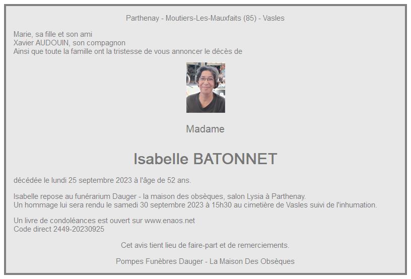 Cet espace « condoléances » est dédié à la mémoire de Madame Isabelle BATONNET.