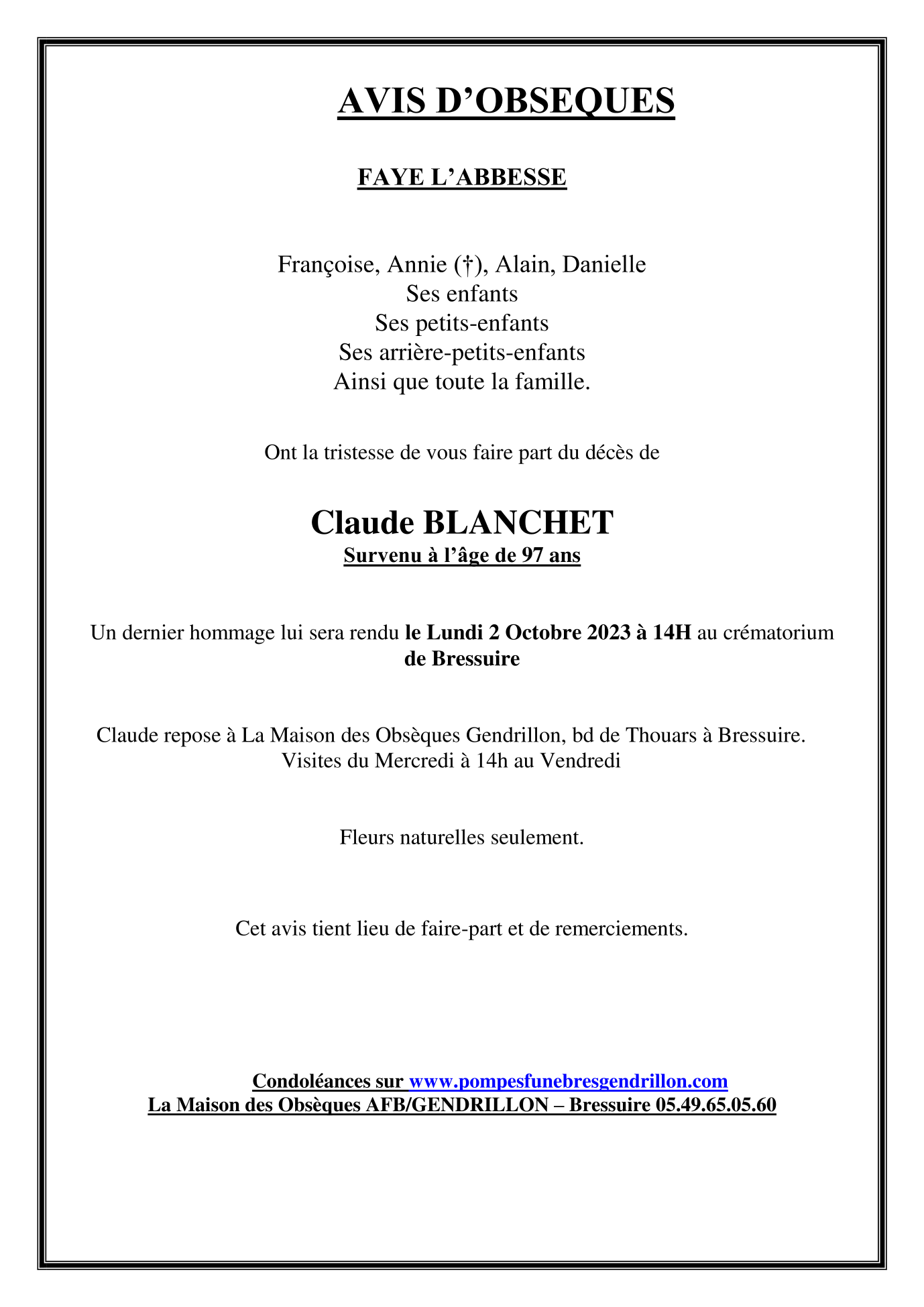 Cet espace « condoléances » est dédié à la mémoire de Monsieur Claude BLANCHET.