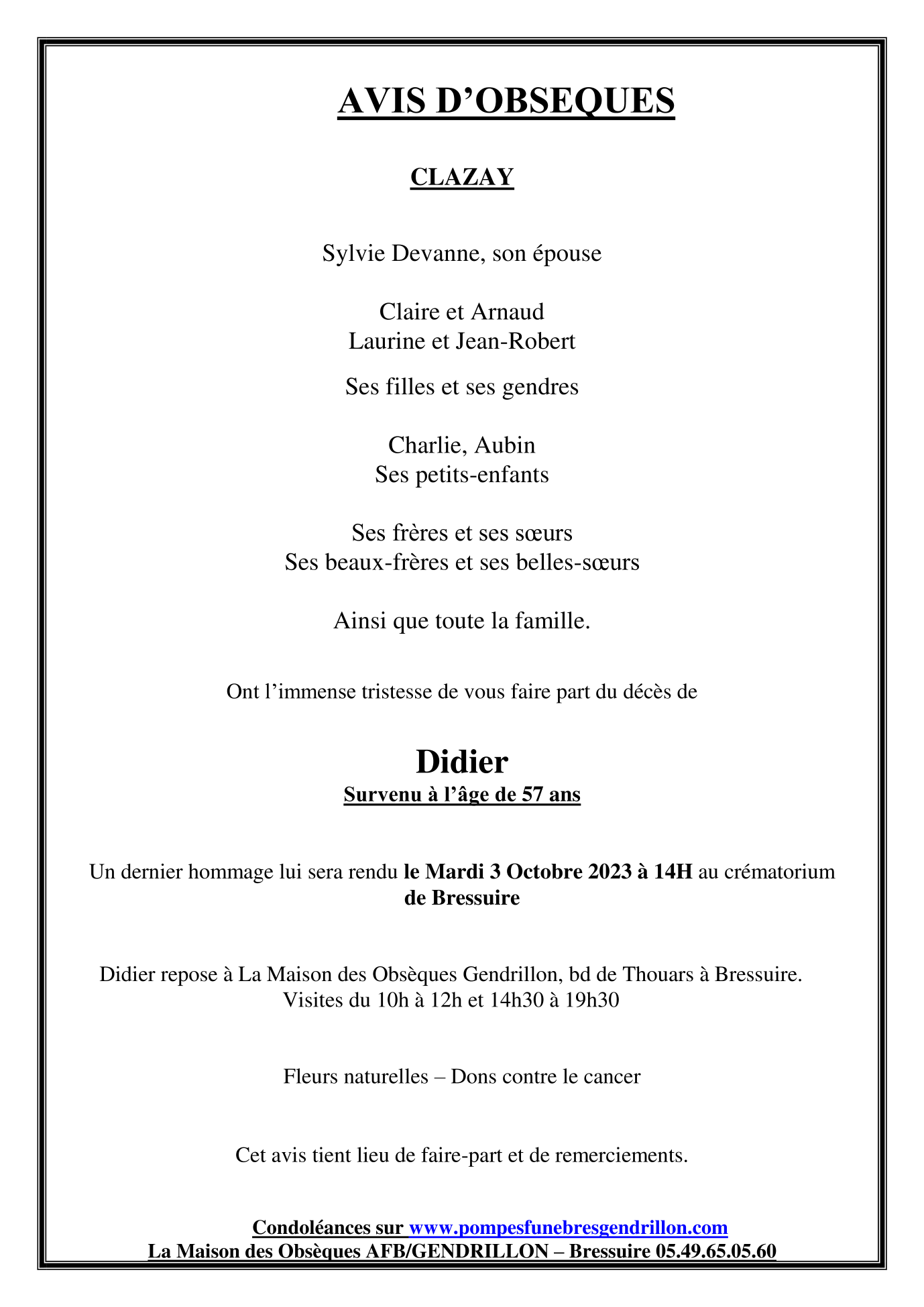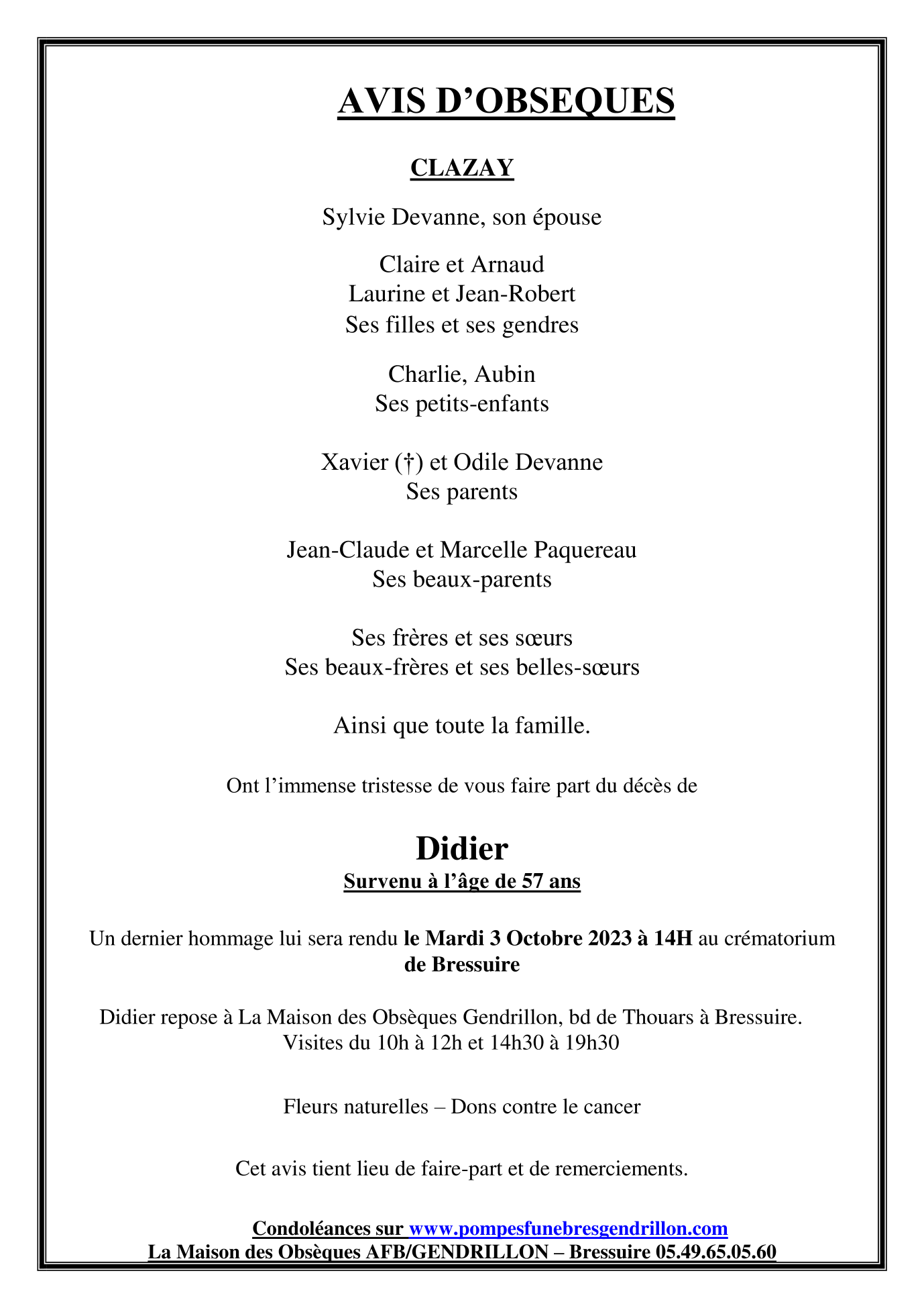 Cet espace « condoléances » est dédié à la mémoire de Monsieur Didier DEVANNE.