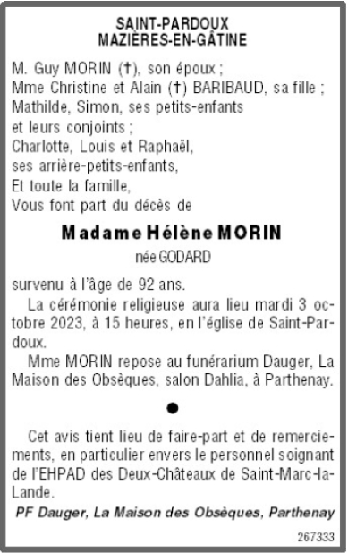 Cet espace « condoléances » est dédié à la mémoire de Madame Hélène MORIN née GODARD.