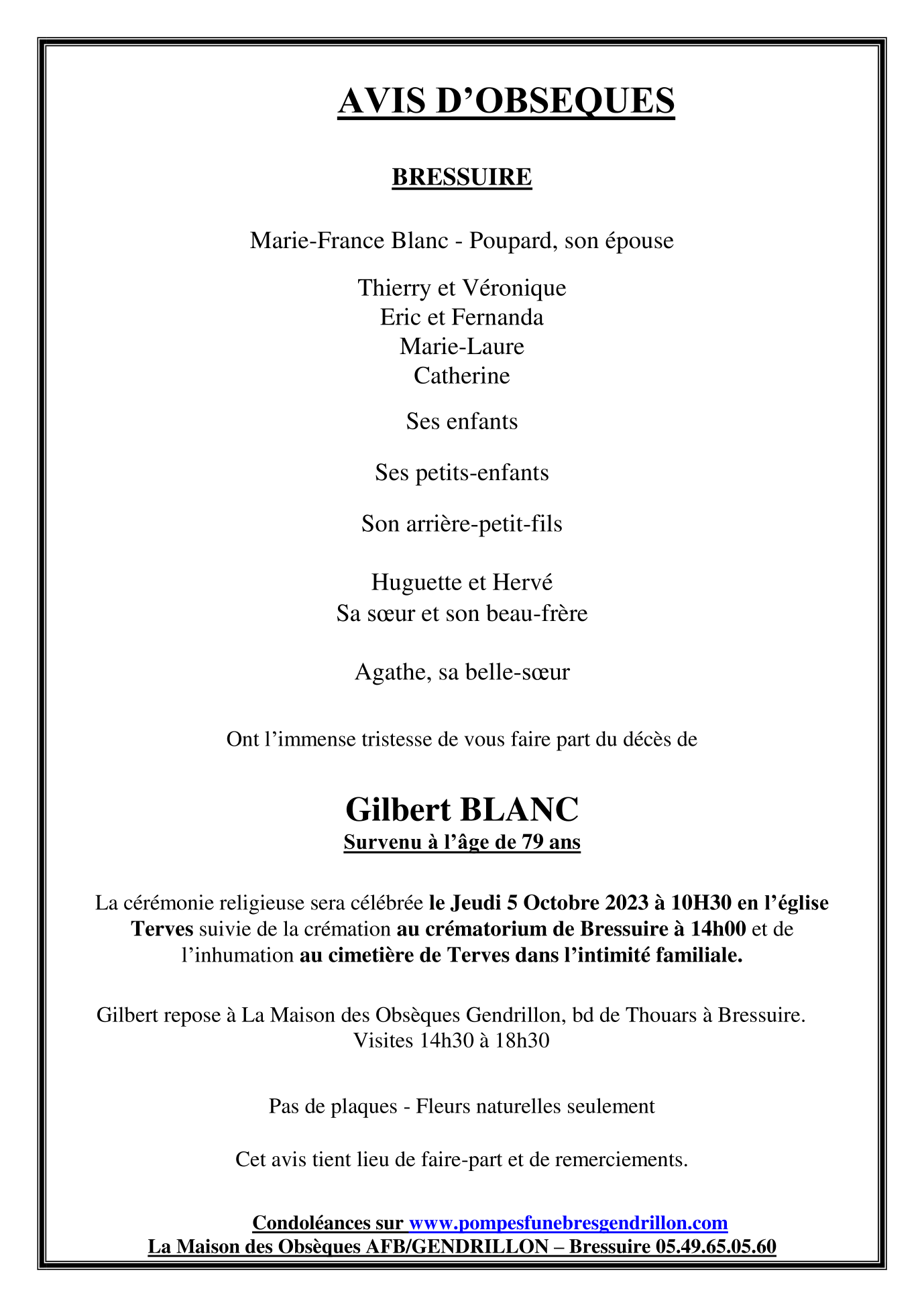 Cet espace « condoléances » est dédié à la mémoire de Monsieur Gilbert BLANC.