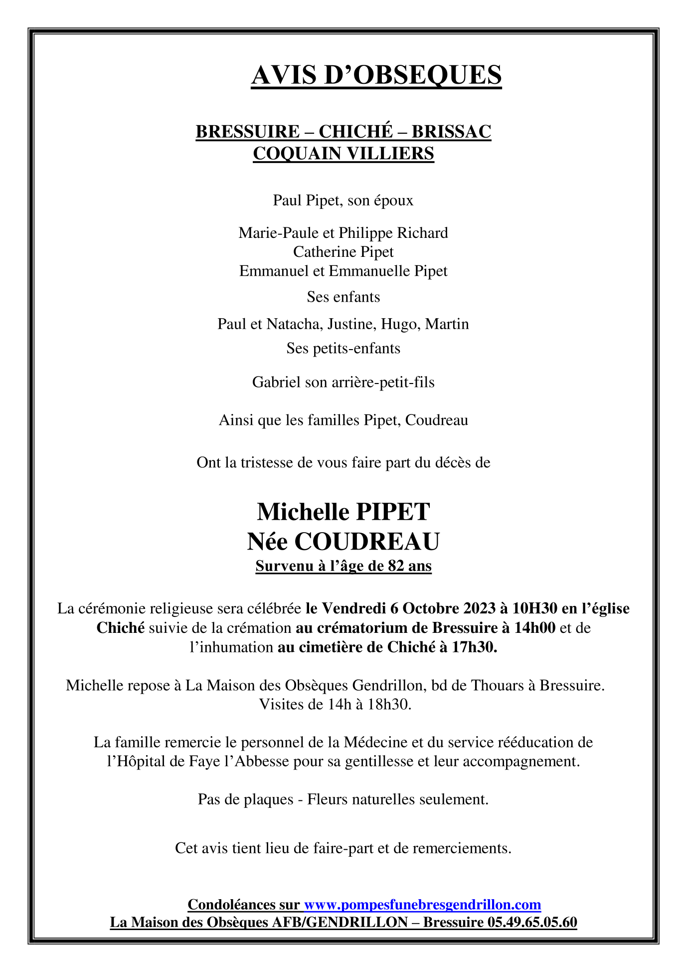 Cet espace « condoléances » est dédié à la mémoire de Madame MICHELLE PIPET née COUDREAU.