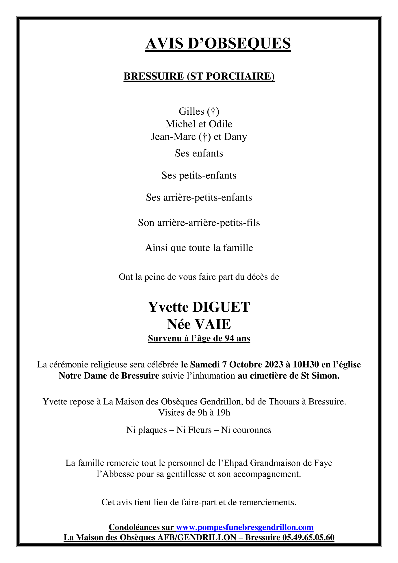 Cet espace « condoléances » est dédié à la mémoire de Madame Yvette DIGUET née VAIE.