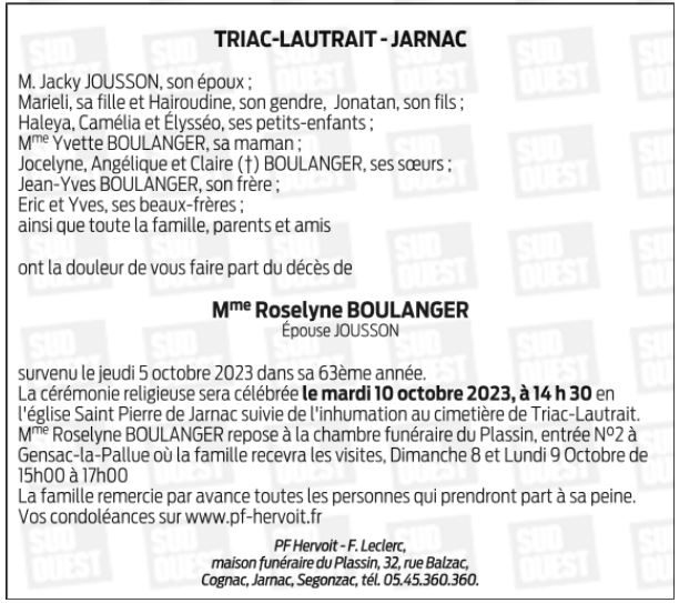 de Madame Roseline JOUSSON née BOULANGER