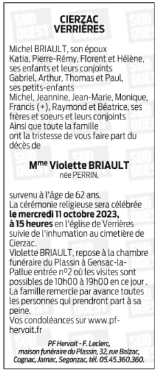 de Madame Violette BRIAULT née PERRIN