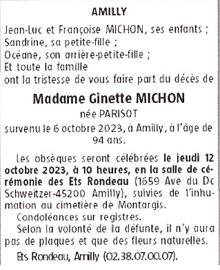 de Madame Ginette MICHON née PARISOT