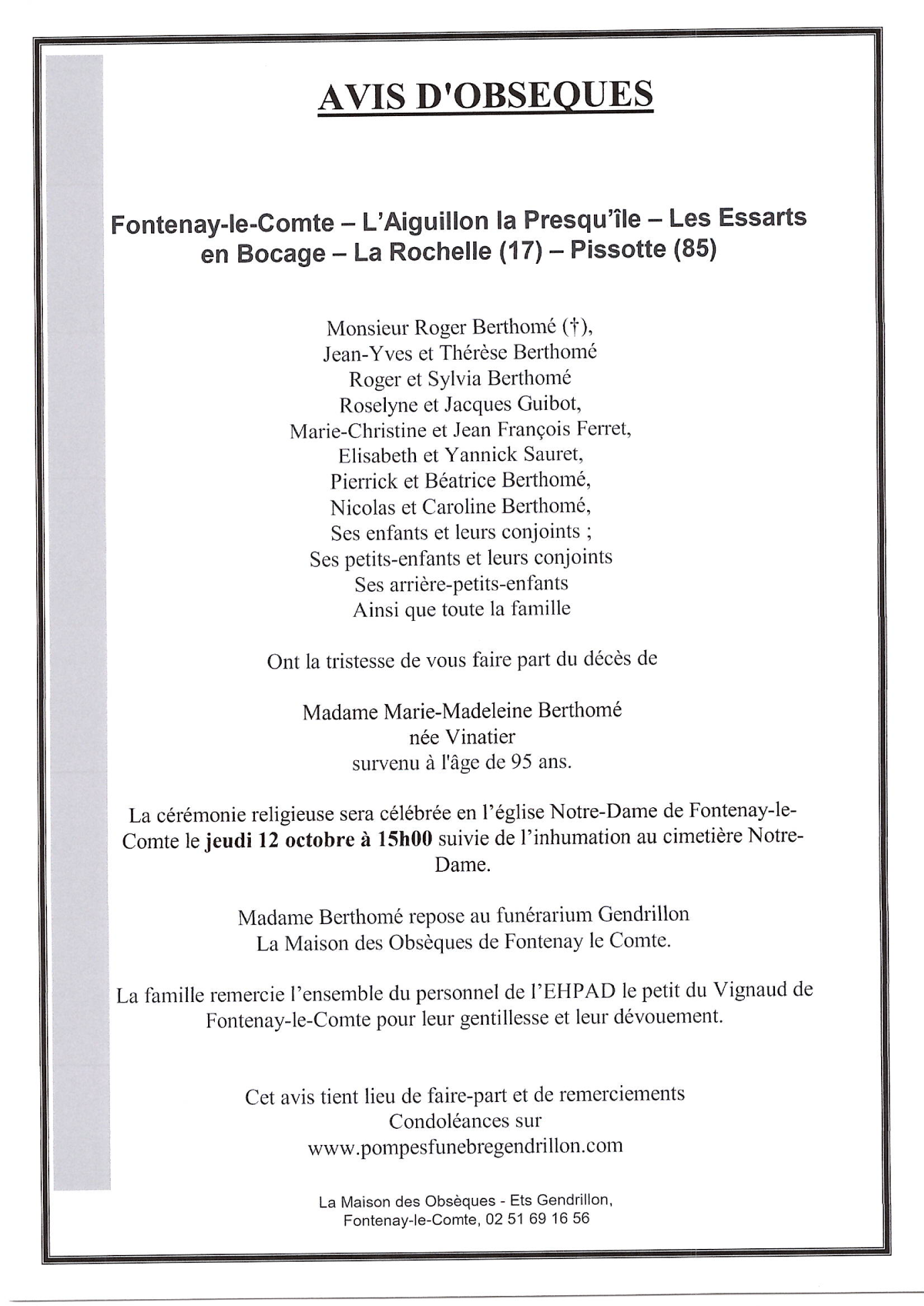 de Madame Marie-Madeleine BERTHOMÉ née VINATIER