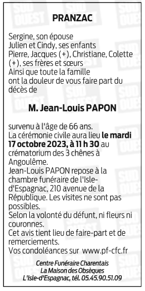 Cet espace « condoléances » est dédié à la mémoire de Monsieur Jean Louis PAPON.