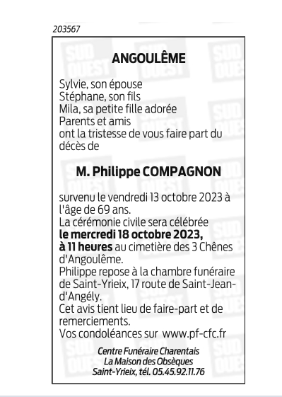 Cet espace « condoléances » est dédié à la mémoire de Monsieur PHILIPPE COMPAGNON.