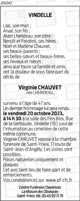 Cet espace « condoléances » est dédié à la mémoire de Madame Virginie CHAUVET née LHERIDEAU.