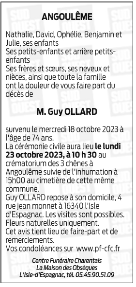 Cet espace « condoléances » est dédié à la mémoire de Monsieur Guy OLLARD.