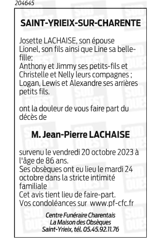 Cet espace « condoléances » est dédié à la mémoire de Monsieur Jean-Pierre LACHAISE.