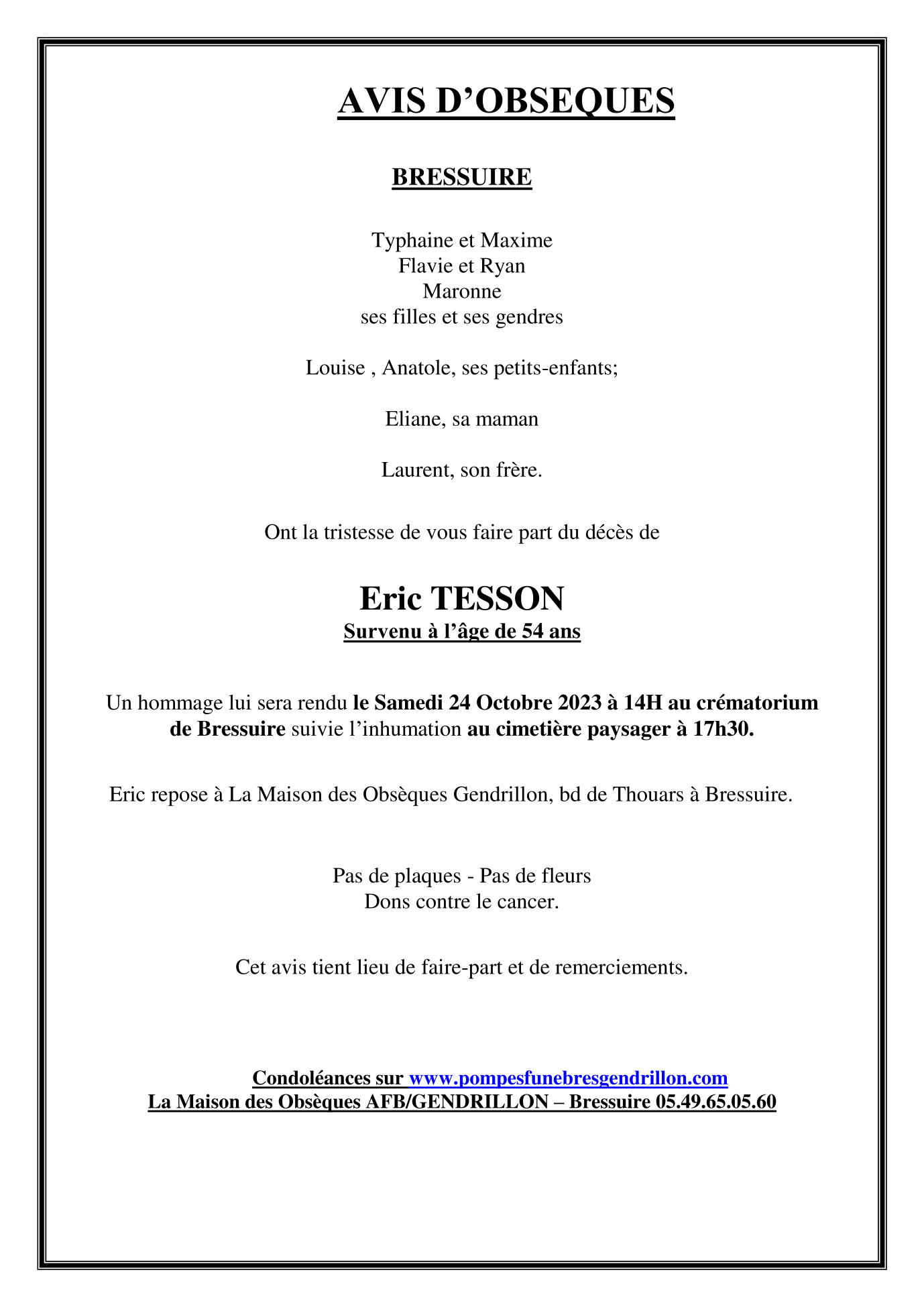 Cet espace « condoléances » est dédié à la mémoire de Monsieur Eric TESSON.