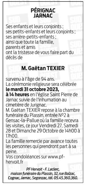 Cet espace « condoléances » est dédié à la mémoire de Monsieur Gaëtan TEXIER.