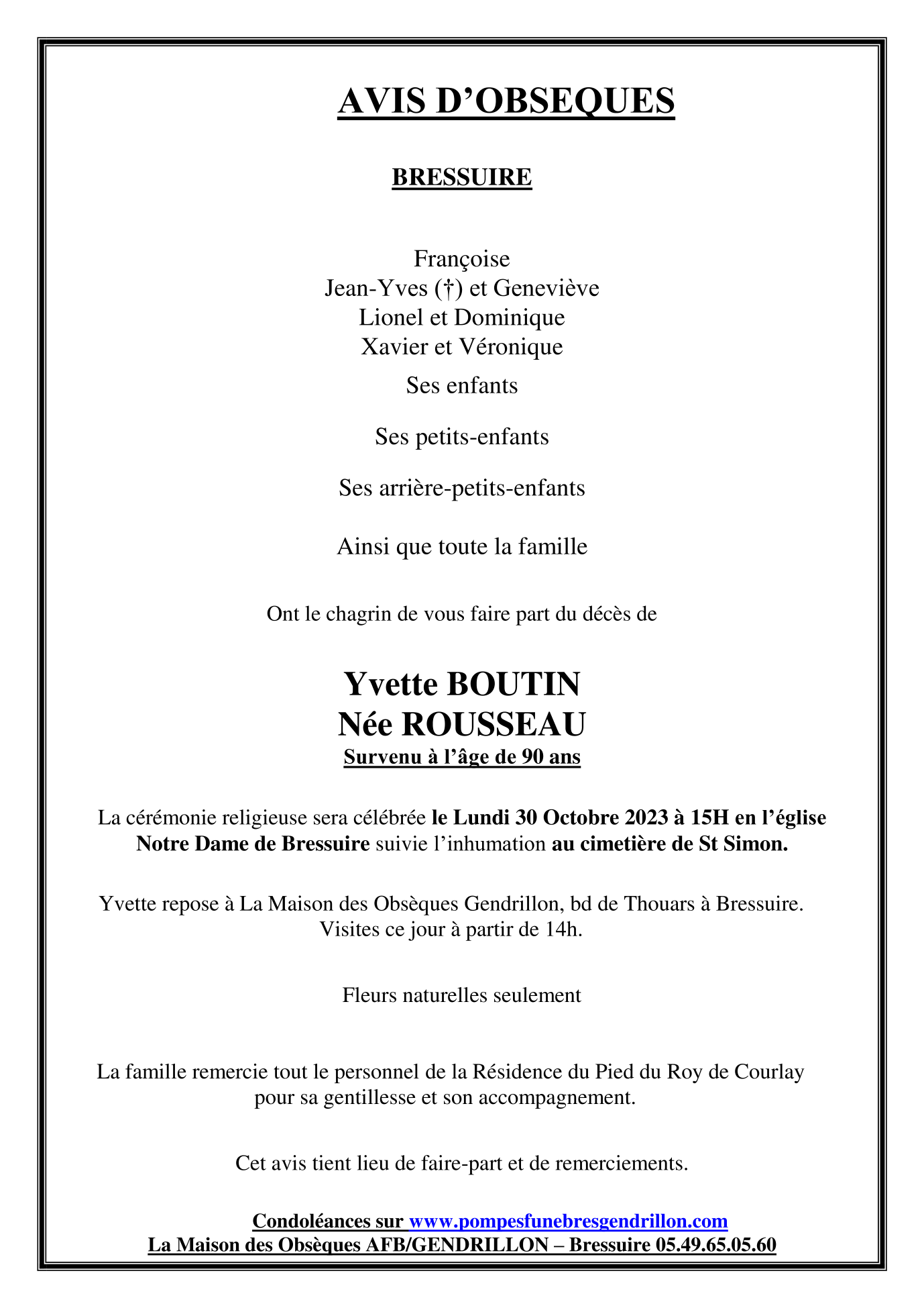 Cet espace « condoléances » est dédié à la mémoire de Madame Yvette BOUTIN née ROUSSEAU.