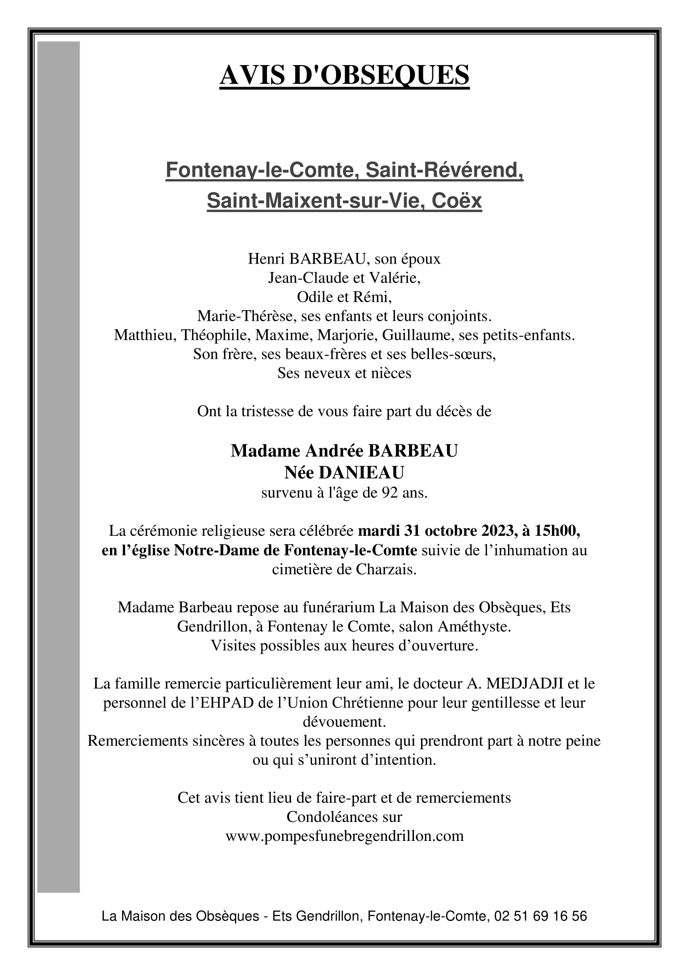 de Madame Andrée BARBEAU née DANIEAU