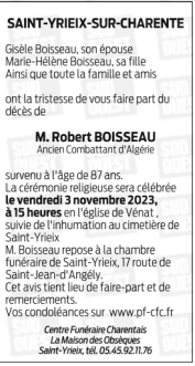 Décédé à Saint-Yrieix-sur-Charente (16710) le lundi 30 octobre 2023
