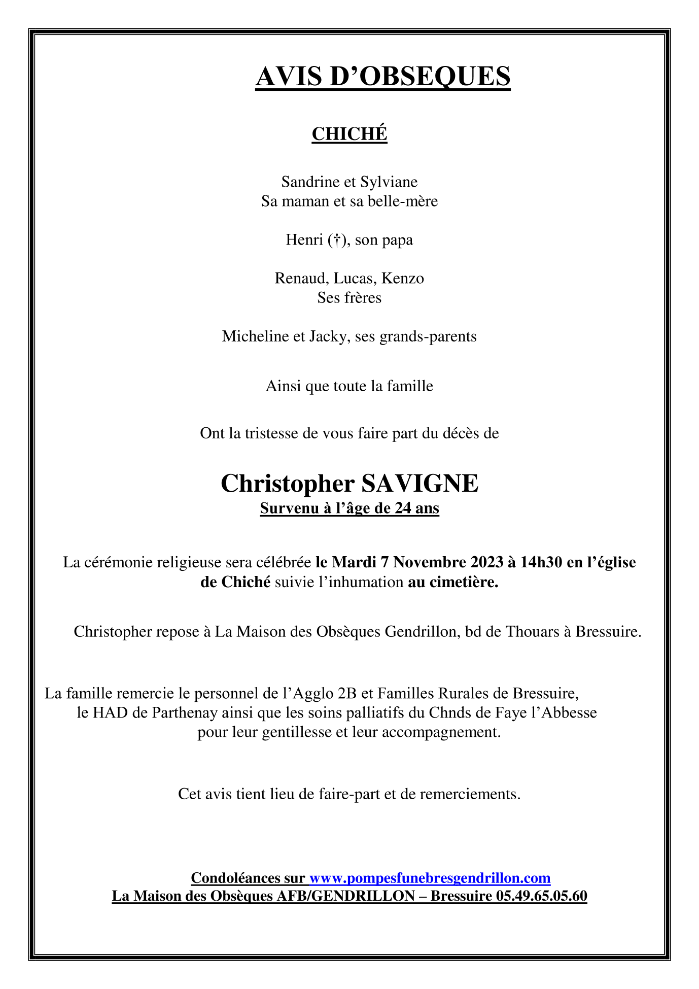 Cet espace « condoléances » est dédié à la mémoire de Monsieur Christopher SAVIGNE.