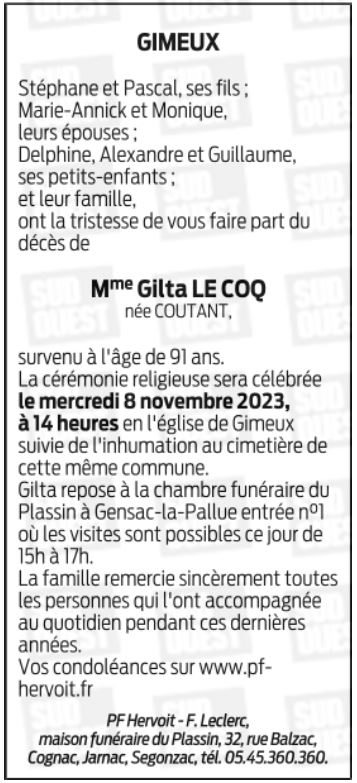 de Madame Gilta LE COQ née COUTANT