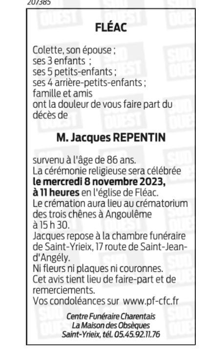 Cet espace « condoléances » est dédié à la mémoire de Monsieur Jacques REPENTIN.