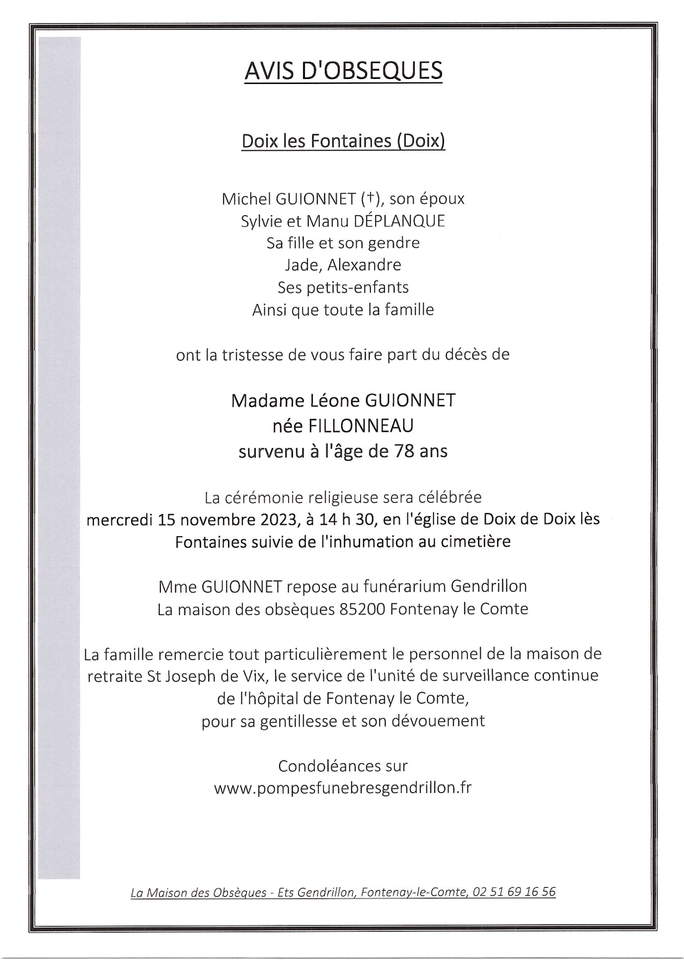Cet espace « condoléances » est dédié à la mémoire de Madame LÉONE GUIONNET née FILLONNEAU.