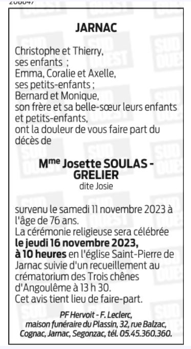 Cet espace « condoléances » est dédié à la mémoire de Madame Josie SOULAS.