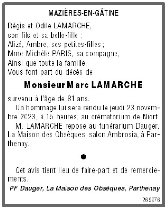 Cet espace « condoléances » est dédié à la mémoire de Monsieur Marc LAMARCHE.