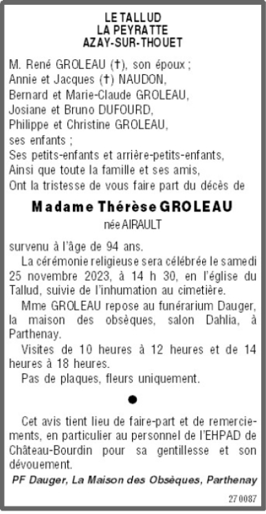 Cet espace « condoléances » est dédié à la mémoire de Madame Thérèse GROLEAU née AIRAULT.