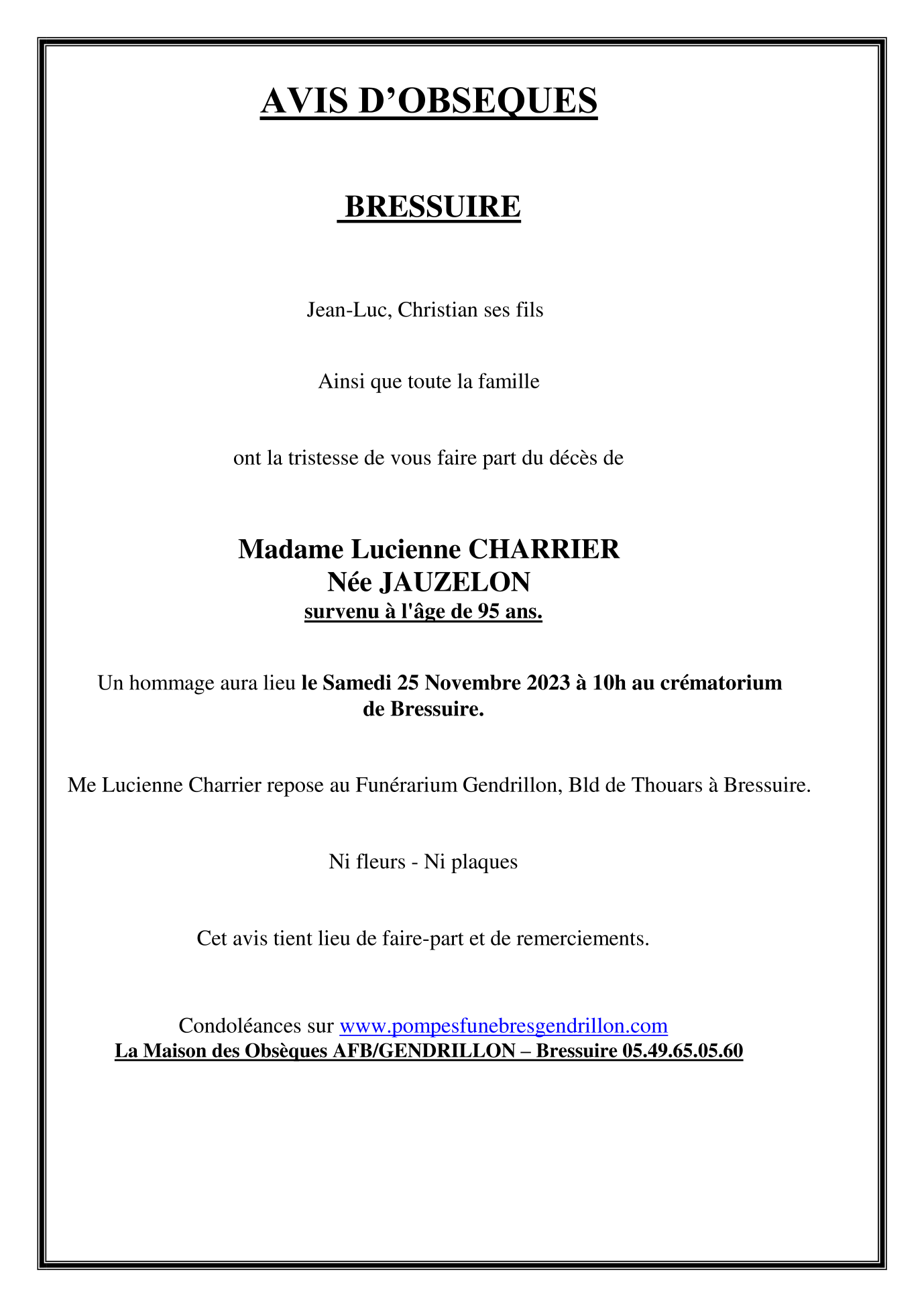 de Madame Lucienne CHARRIER née JAUZELON