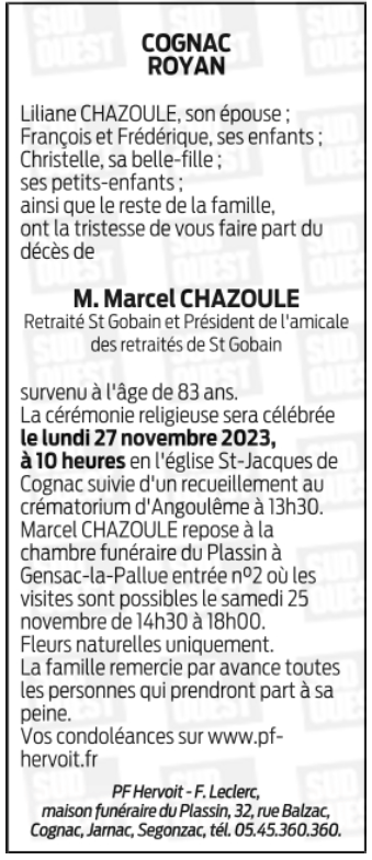 Cet espace « condoléances » est dédié à la mémoire de Monsieur Marcel CHAZOULE.