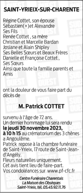 Cet espace « condoléances » est dédié à la mémoire de Monsieur Patrick COTTET.