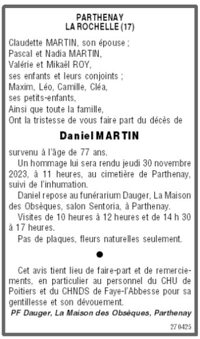 Cet espace « condoléances » est dédié à la mémoire de Monsieur Daniel MARTIN.