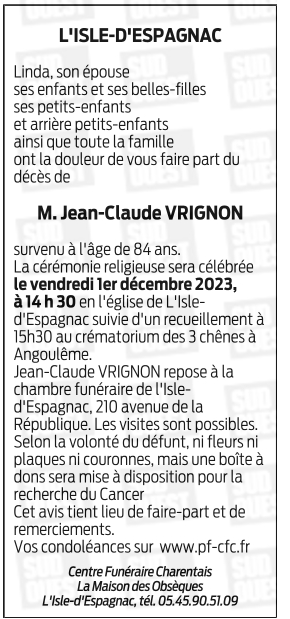 Décédé à L'Isle-d'Espagnac (16340) le lundi 27 novembre 2023