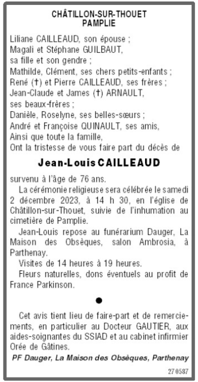 Cet espace « condoléances » est dédié à la mémoire de Monsieur Jean-Louis CAILLEAUD.
