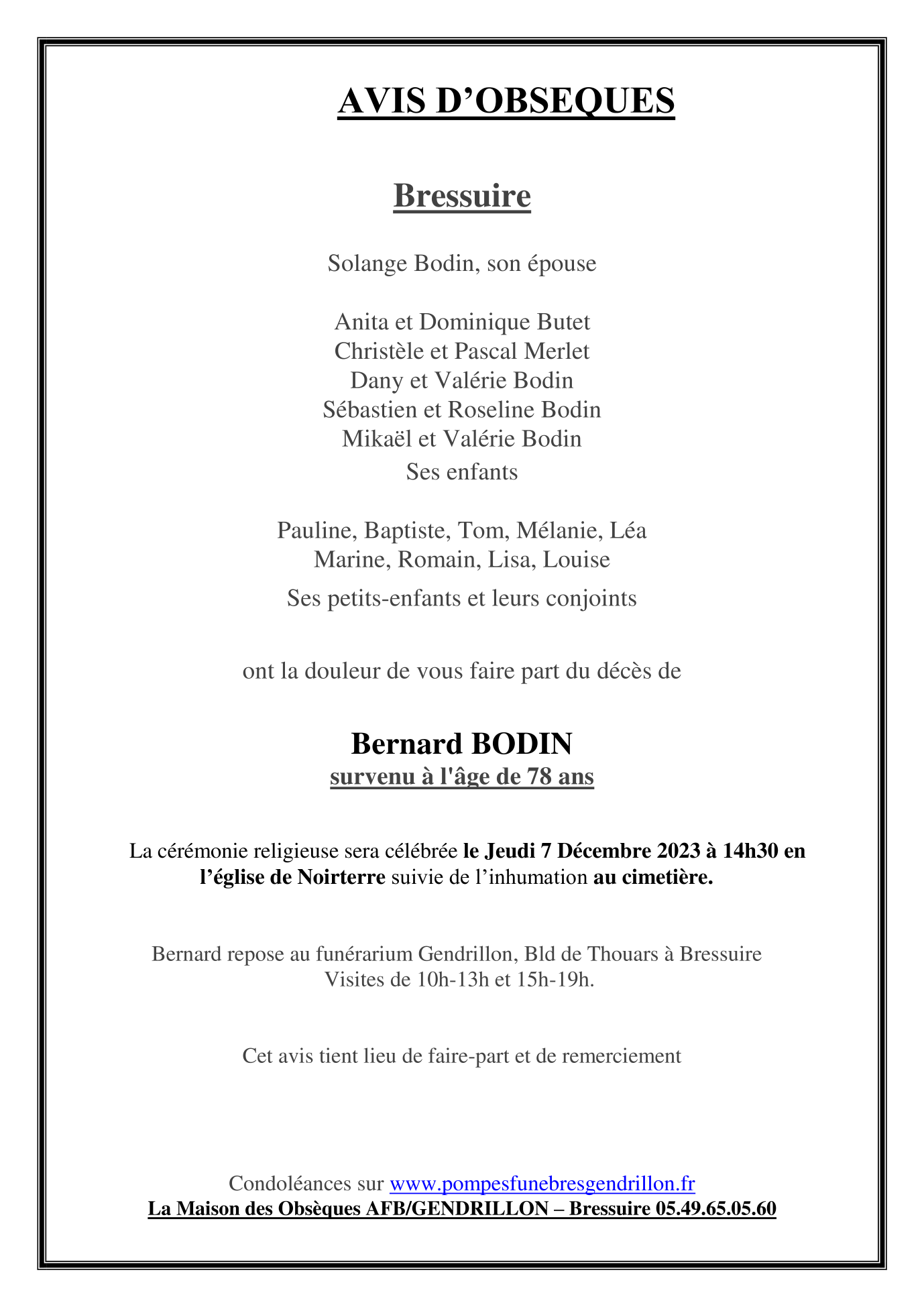 Cet espace « condoléances » est dédié à la mémoire de Monsieur Bernard BODIN.