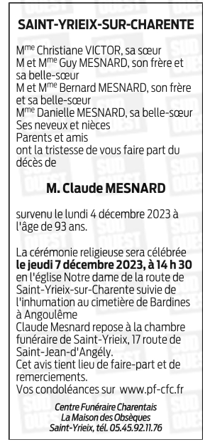 Cet espace « condoléances » est dédié à la mémoire de Monsieur Claude MESNARD.