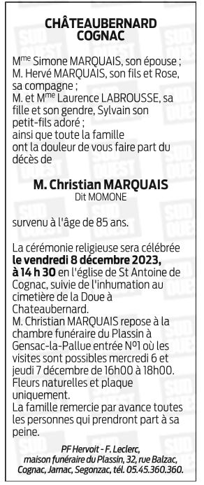 Cet espace « condoléances » est dédié à la mémoire de Monsieur Christian MARQUAIS.