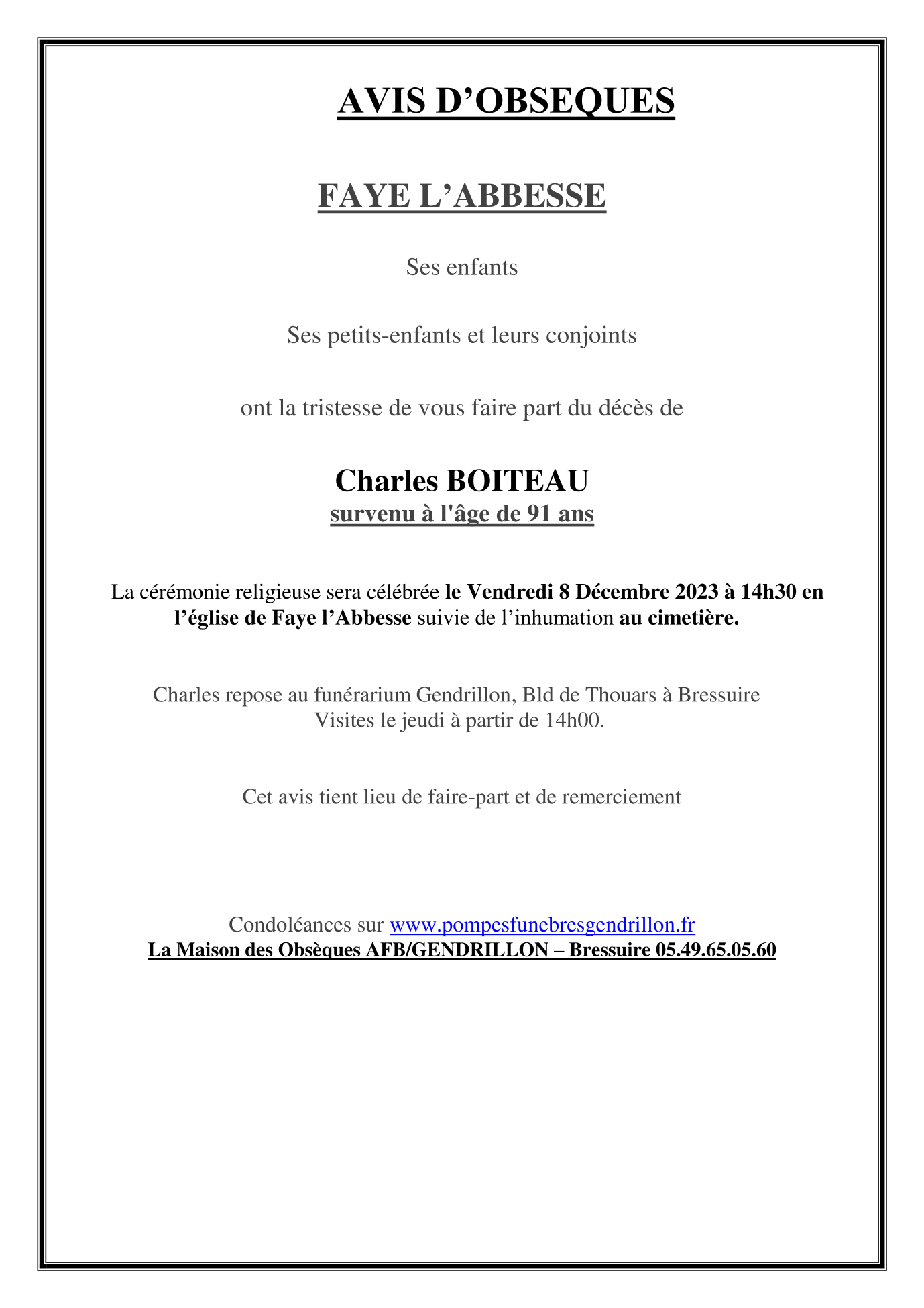 Cet espace « condoléances » est dédié à la mémoire de Monsieur Charles BOITEAU.