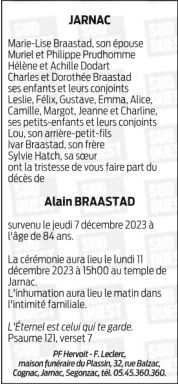 Cet espace « condoléances » est dédié à la mémoire de Monsieur Alain BRAASTAD.