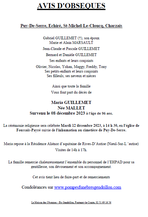 Cet espace « condoléances » est dédié à la mémoire de Madame Maria GUILLEMET née MALLET.