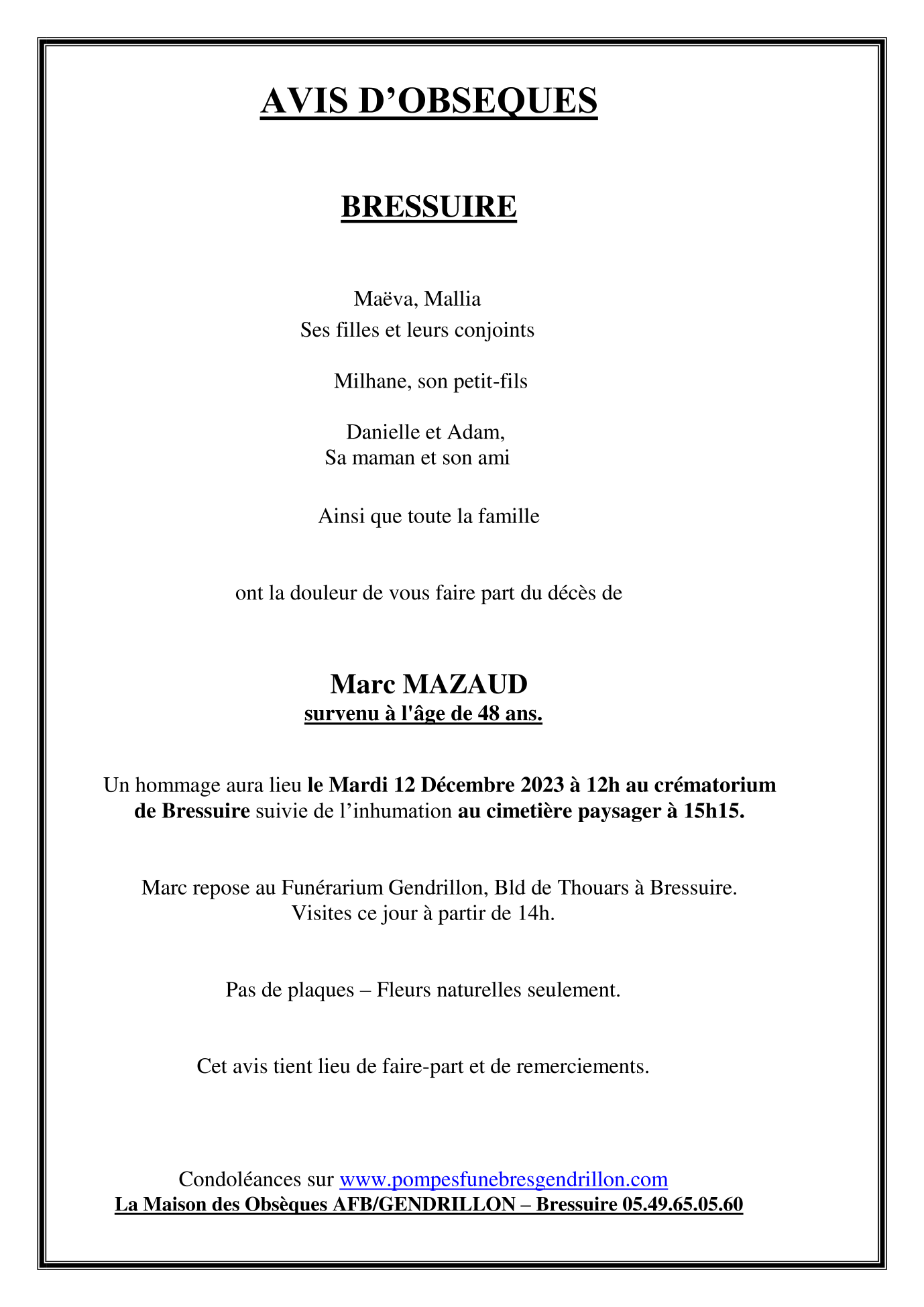 Cet espace « condoléances » est dédié à la mémoire de Monsieur Marc MAZAUD.