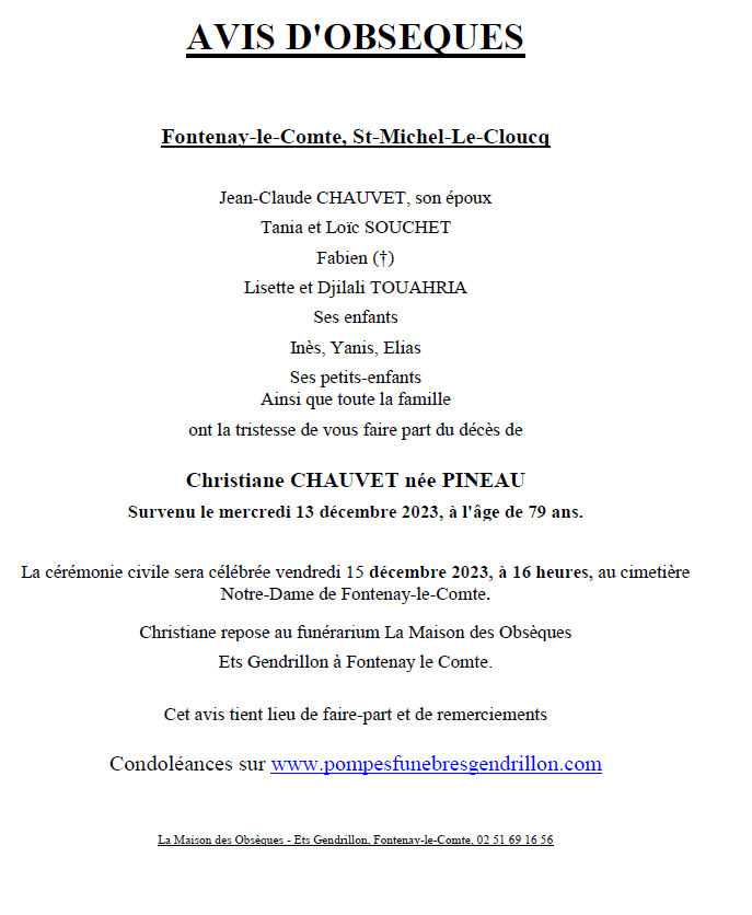 de Madame Christiane CHAUVET née PINEAU