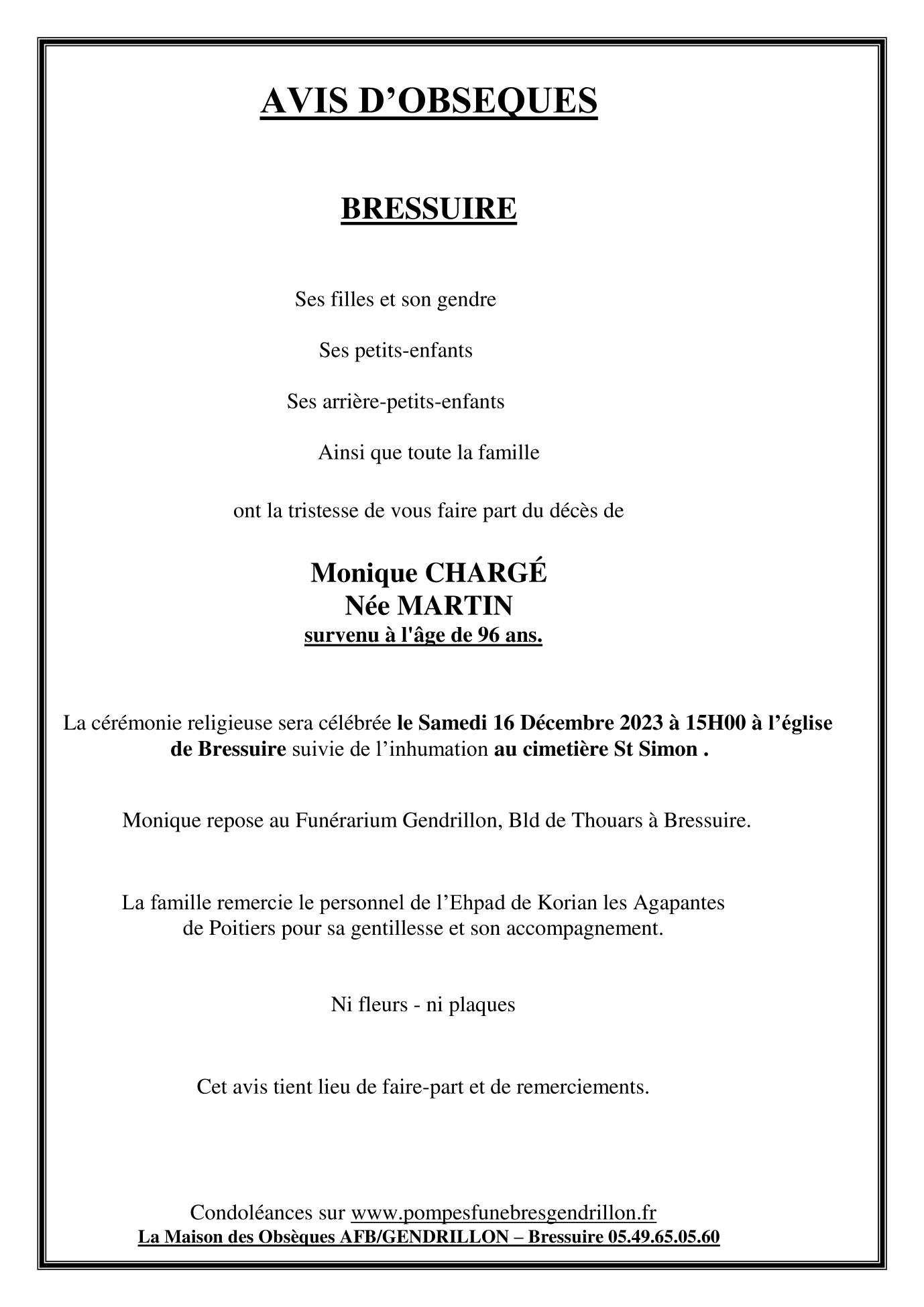 de Madame Monique CHARGÉ née MARTIN